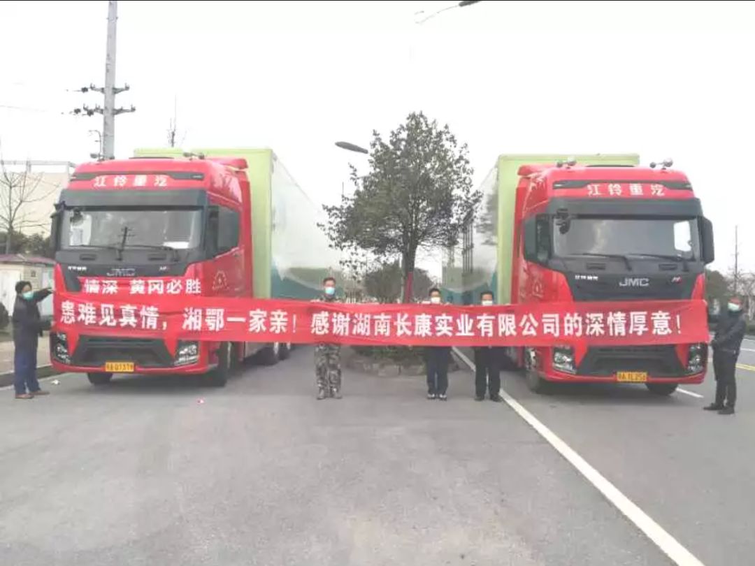 3月2日,冒著細(xì)雨,長(zhǎng)康實(shí)業(yè)兩輛掛著“情系大別山”橫幅,滿載50萬長(zhǎng)康生活物資的大貨車,從湖南出發(fā)馳援湖北黃岡。